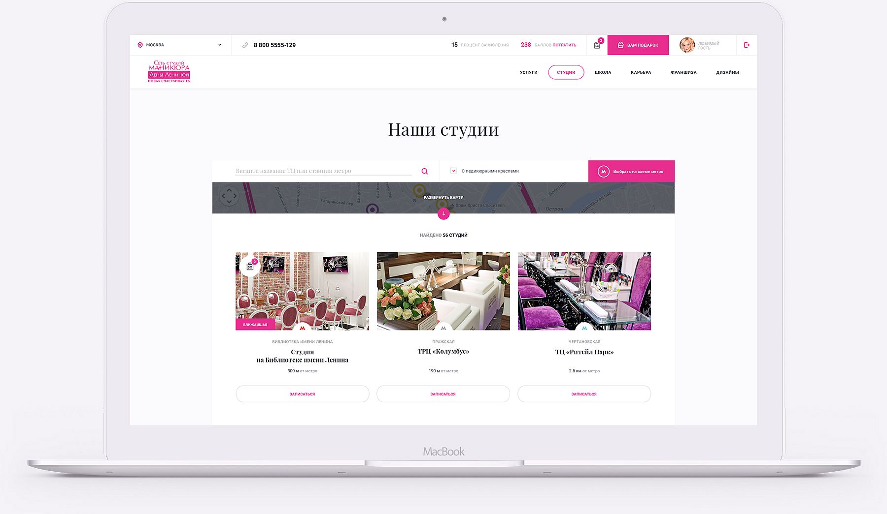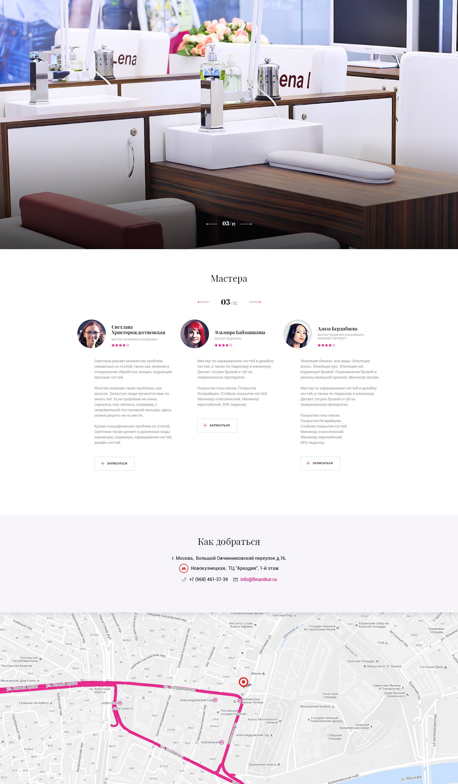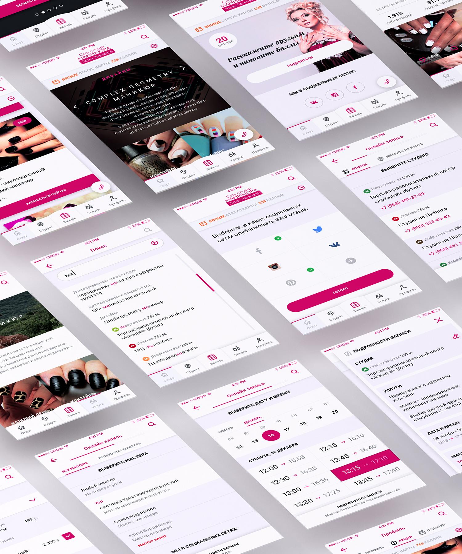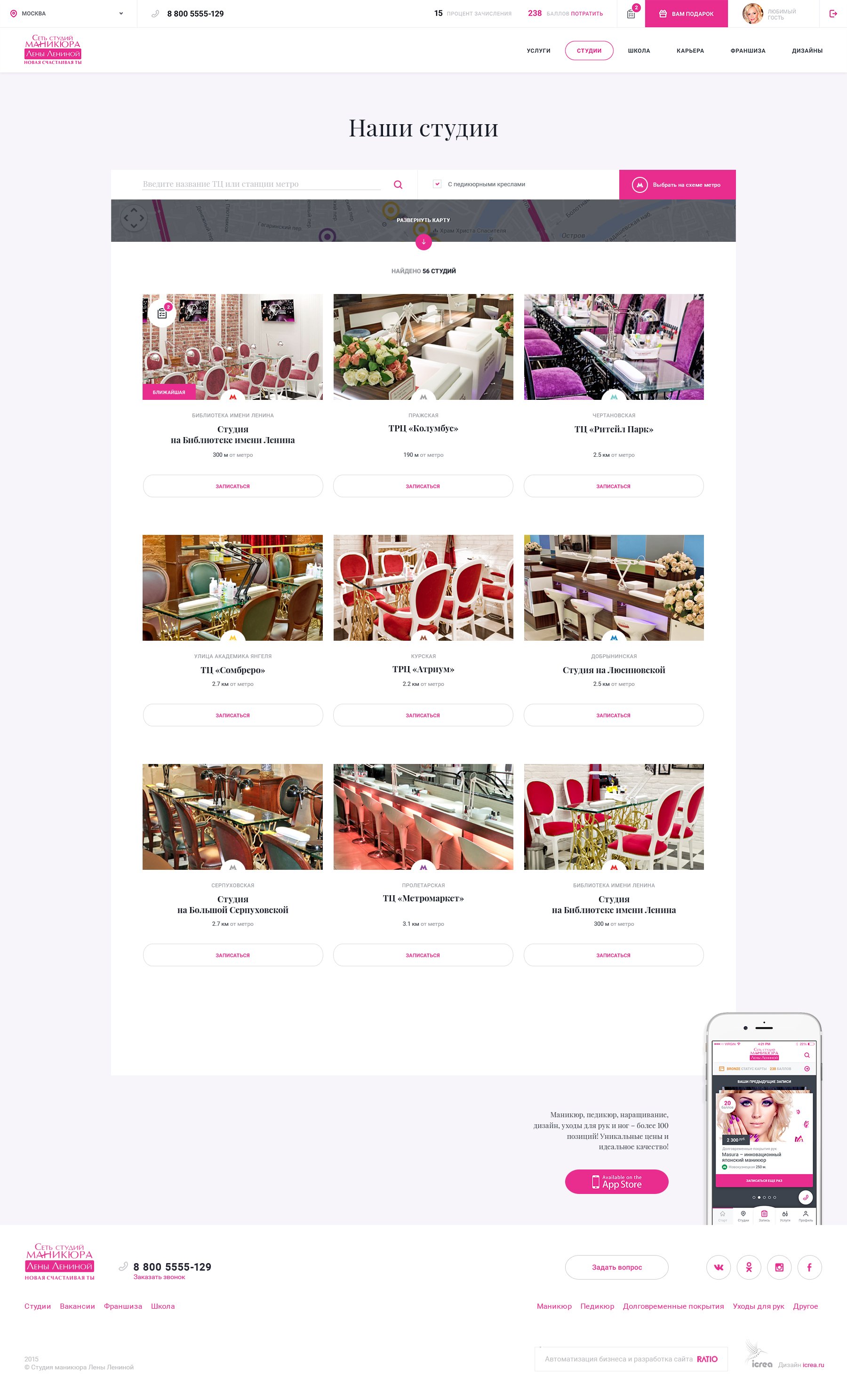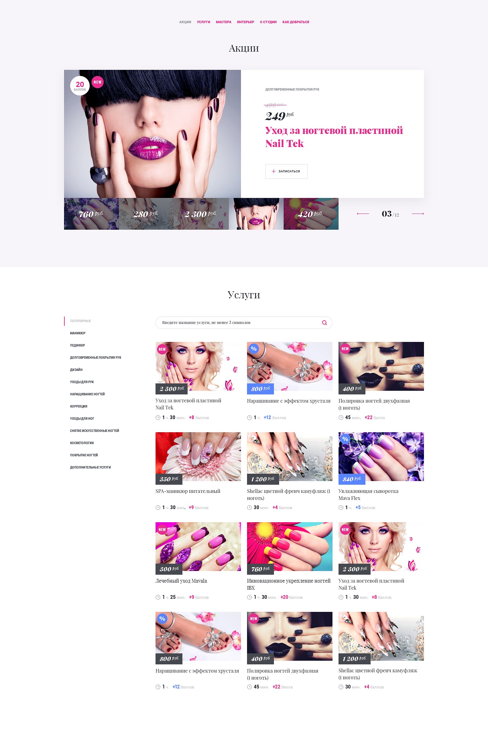 На проекте максимально раскрыта информация о студиях маникюра и услугах. Персонализированный поиск предлагает более легкий доступ к деталям и конфигурациям процедур с привязкой к географическому расположению студий, находящихся рядом с пользователем.