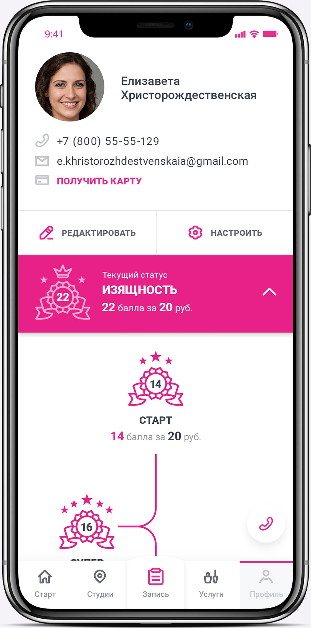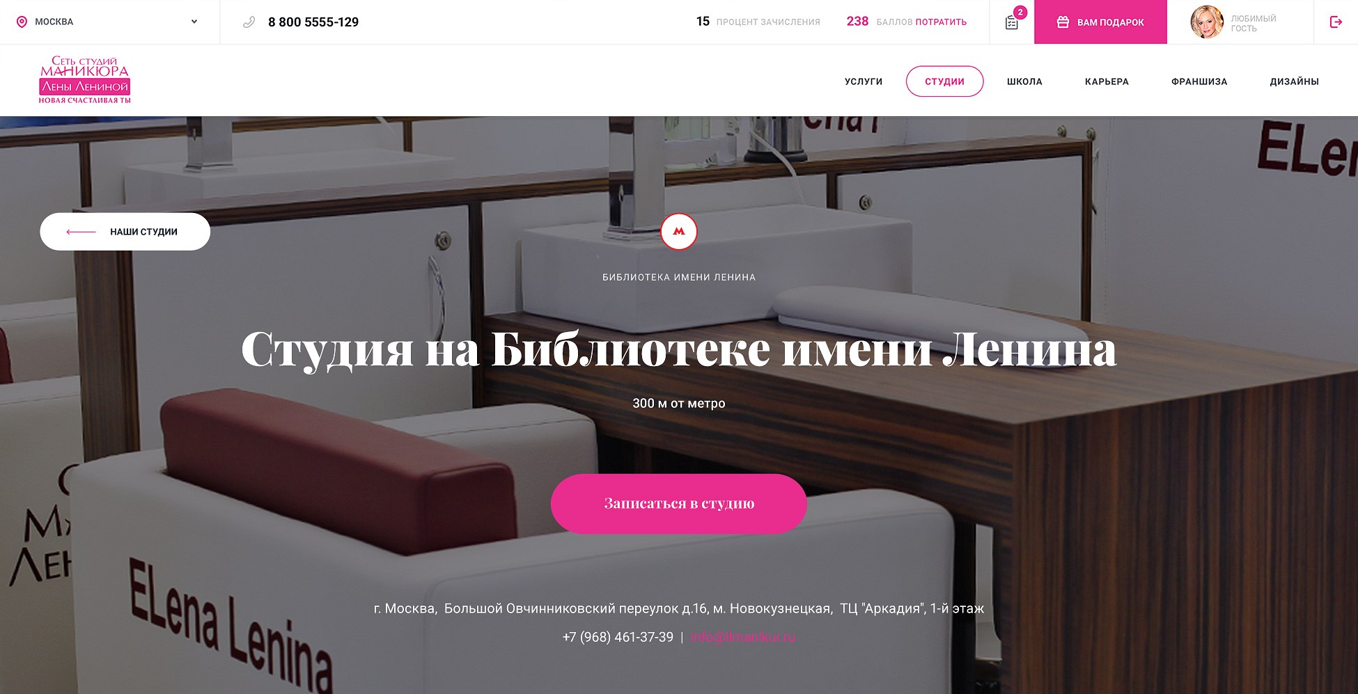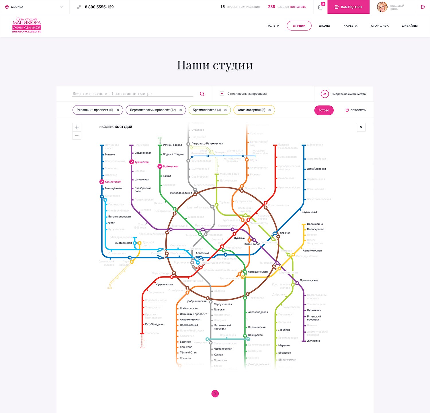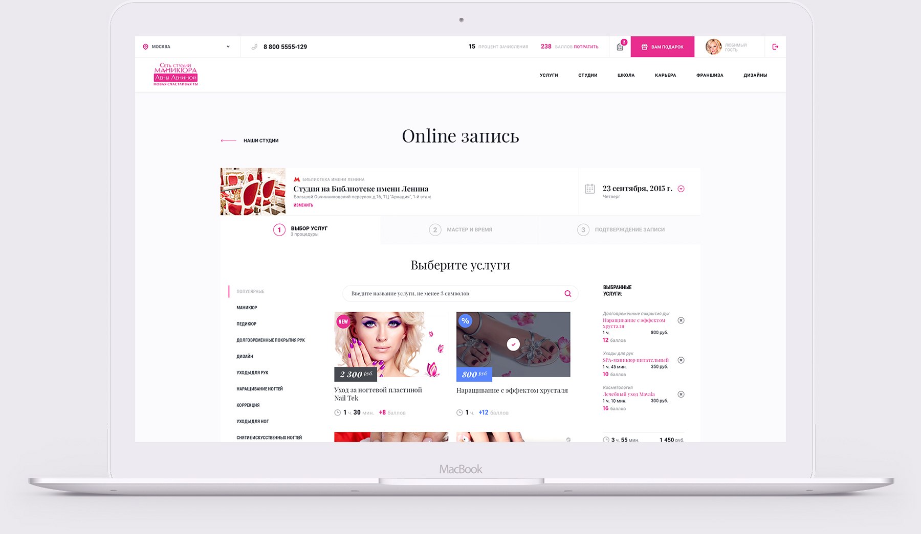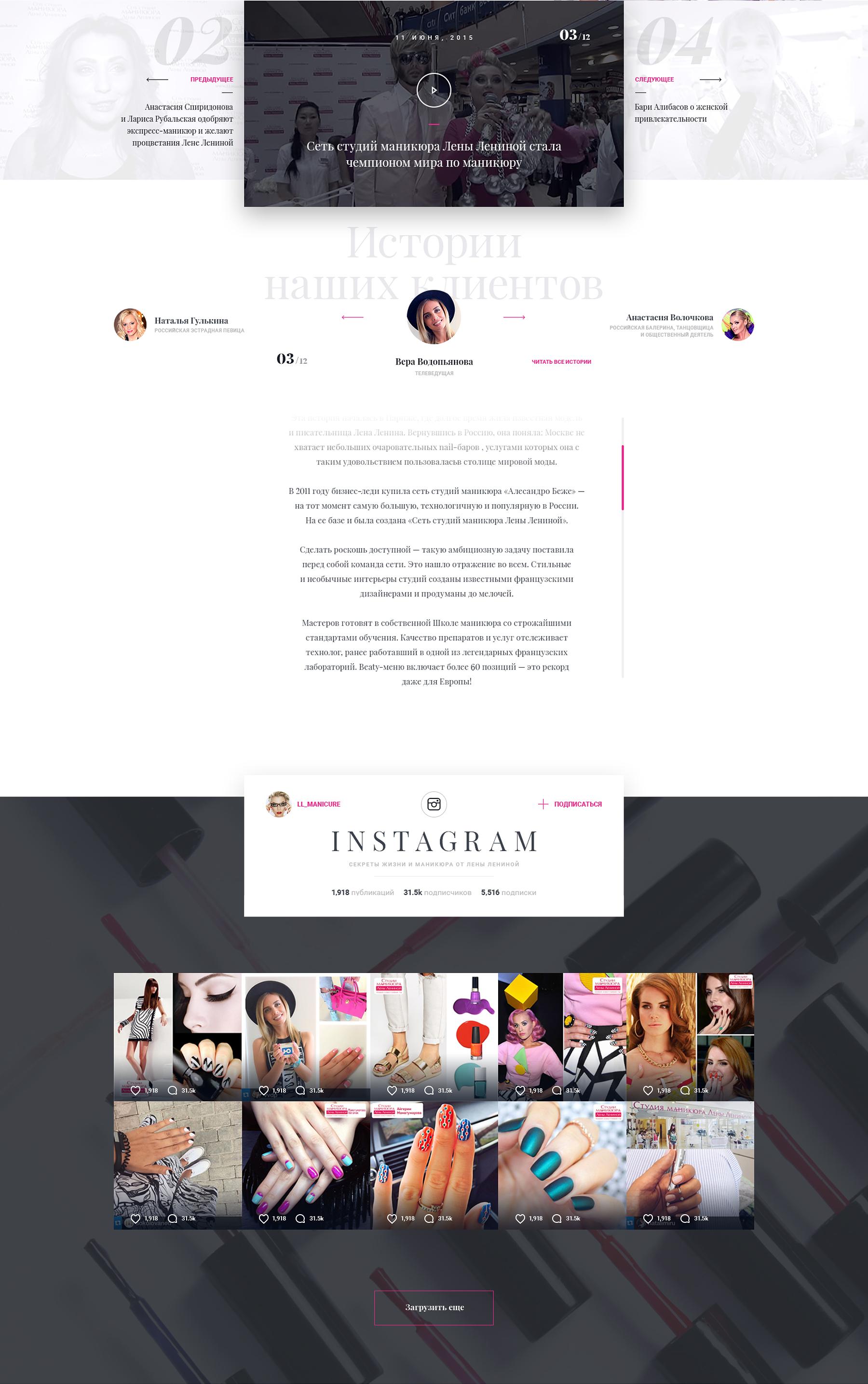 На проекте максимально раскрыта информация о студиях маникюра и услугах. Персонализированный поиск предлагает более легкий доступ к деталям и конфигурациям процедур с привязкой к географическому расположению студий, находящихся рядом с пользователем.